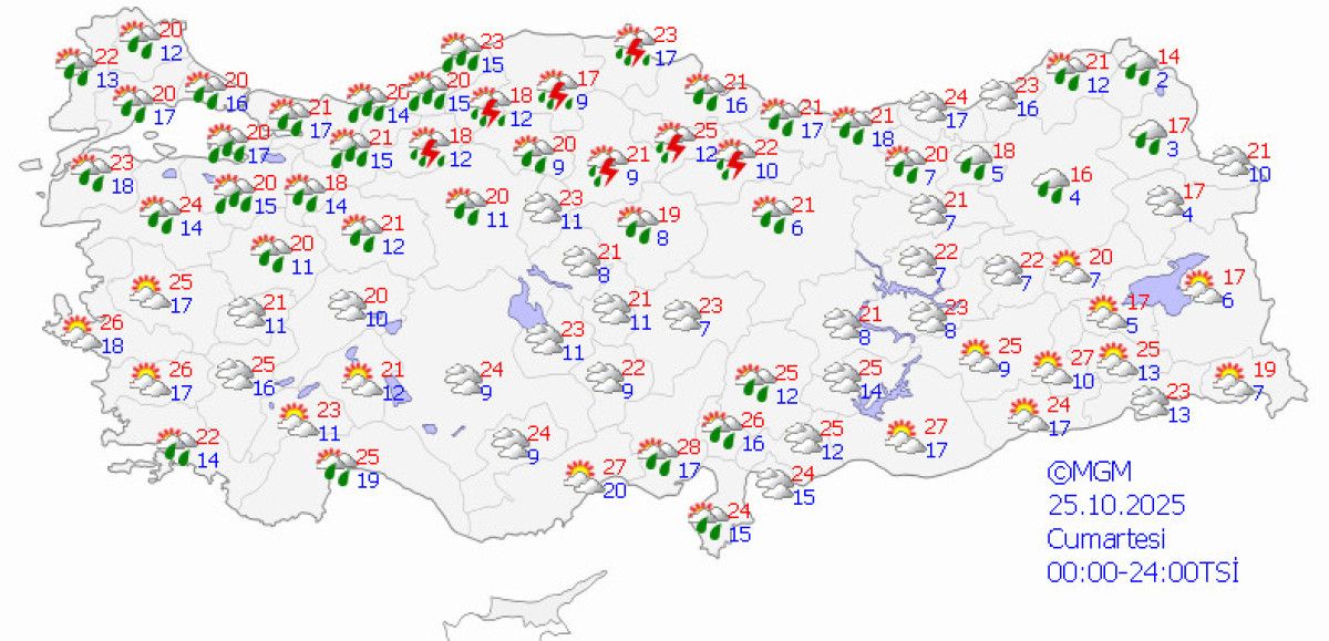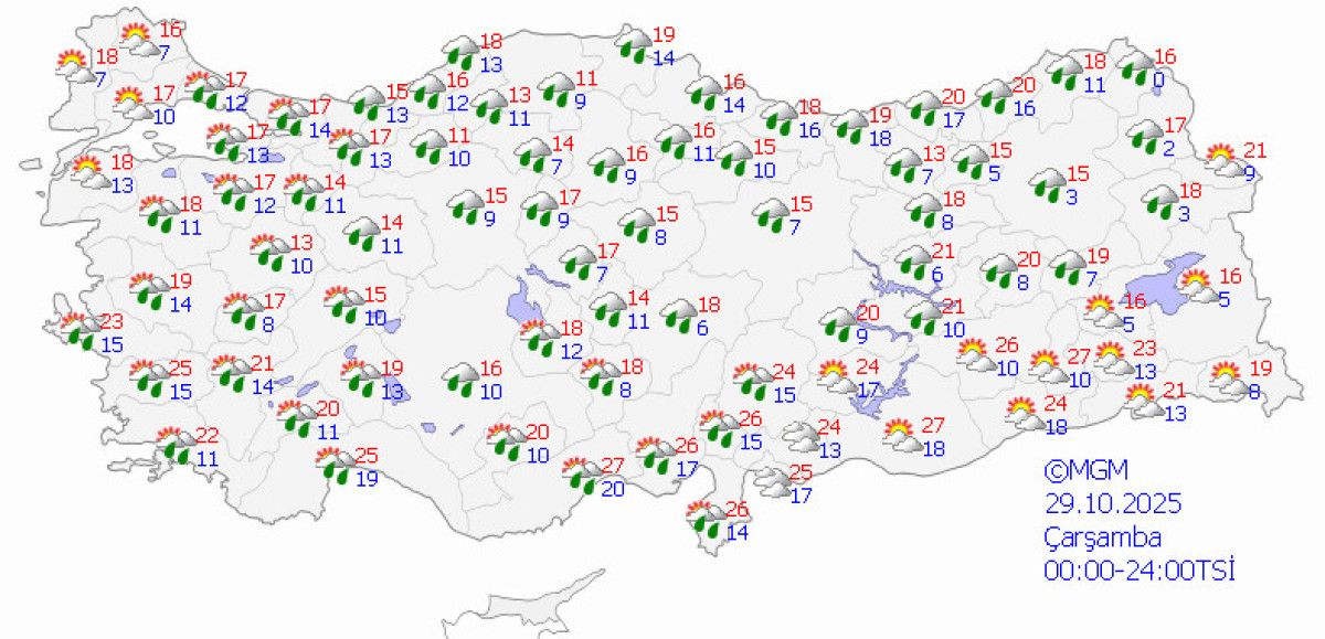 Meteoroloji Genel Müdürlüğü’nün son raporuna göre, Türkiye genelinde hava parçalı bulutlu ve yer yer çok bulutlu olacak. Marmara’nın güney ve doğusu, Kıyı Ege, Karadeniz, Ankara’nın kuzeyi, Hatay kıyıları, Sivas, Çankırı, Antalya, Adana, Osmaniye, Ardahan ve Kars çevrelerinde yağmur ve sağanak yağış bekleniyor. Doğu Karadeniz ve Doğu Anadolu’nun bazı bölgelerinde ise karla karışık yağmur görülebilir.