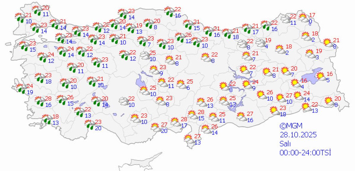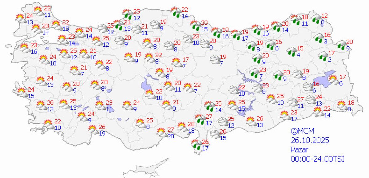 En yüksek sıcaklık değerlerine göre, Ankara ve İstanbul’da 20, İzmir’de 26, Antalya’da 25, Adana’da 28, Konya’da 24, Bolu’da 18, Samsun’da 21, Erzurum’da 16 ve Diyarbakır’da 25 derece civarında seyredecek. İzmir’de güneşli bir gün beklenirken, diğer illerde hava durumu değişken olacak.