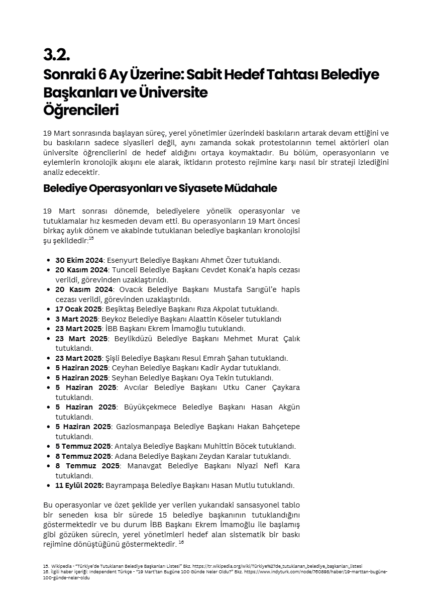 Çalışma, 19 Mart’taki soruşturmaların ardından Türkiye’nin birçok ilinde üniversiteli gençlerin katıldığı protesto dalgasını ve bu süreçte kayda geçen ihlalleri kapsıyor. Raporda, öğrencilerin yalnızca bir siyasi aktöre destek vermek amacıyla değil, “hukukun üstünlüğü, ifade özgürlüğü ve toplanma hakkı” gibi temel demokratik talepler için sokağa çıktığı vurgulanıyor.