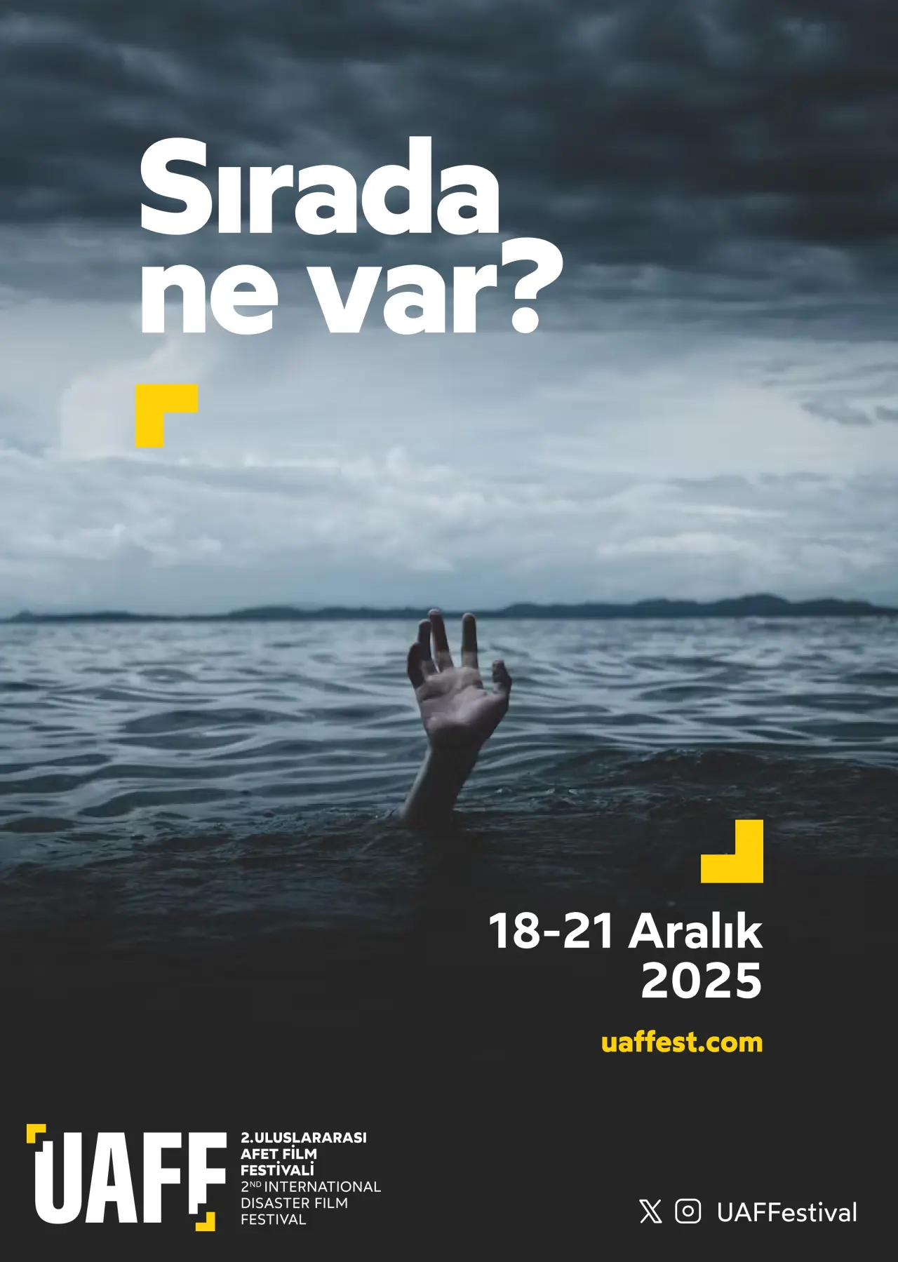 Afetlerin insan hayatına ve doğaya olan etkisini sinemanın eşsiz diliyle anlatmayı hedefleyen festivalde ödül kazanan filmler, Türkiye’nin 7 bölgesindeki 7 şehirde ve Polonya’da düzenlenecek özel gösterimlerle izleyiciyle buluşacak. 2. Uluslararası Afet Film Festivali’nin afişinde yer alan “Sırada Ne Var?” yazısı dikkat çekiliyor.