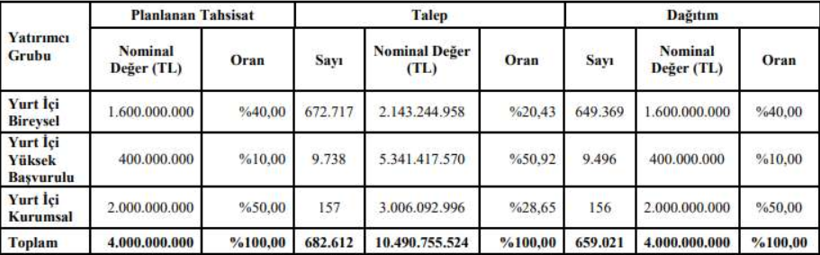 Yurt içi bireysel yatırımcılardan nihai tahsisatın 1,34 katı, yüksek başvurulu yatırımcılardan 13,35 katı, kurumsal yatırımcılardan ise 1,5 katı oranında talep geldi.